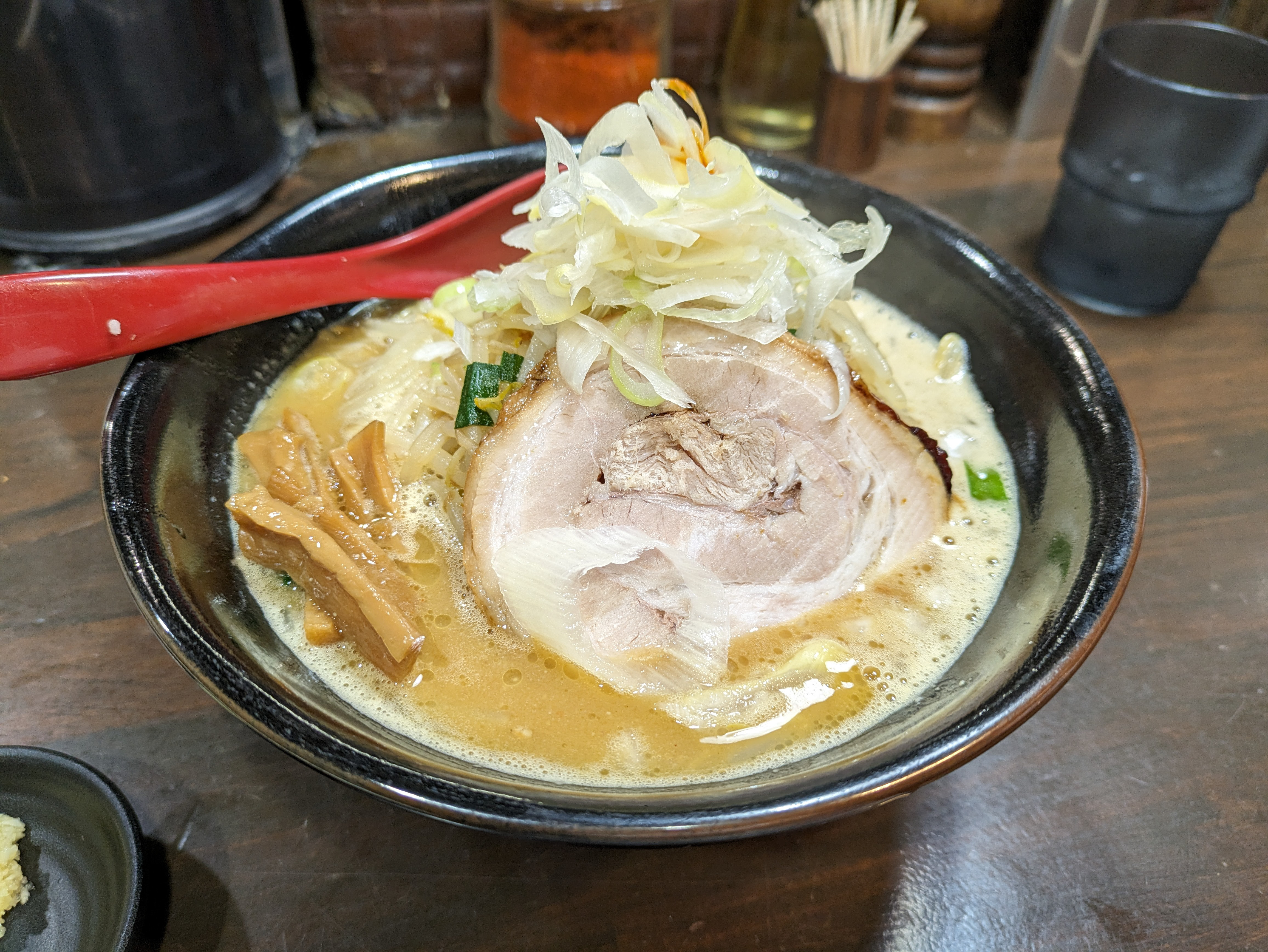 蛍光灯の室内で撮ったラーメン。うっかりするとホワイトバランスが崩壊してしまいそうな場面ですが、なんとか保っている感。