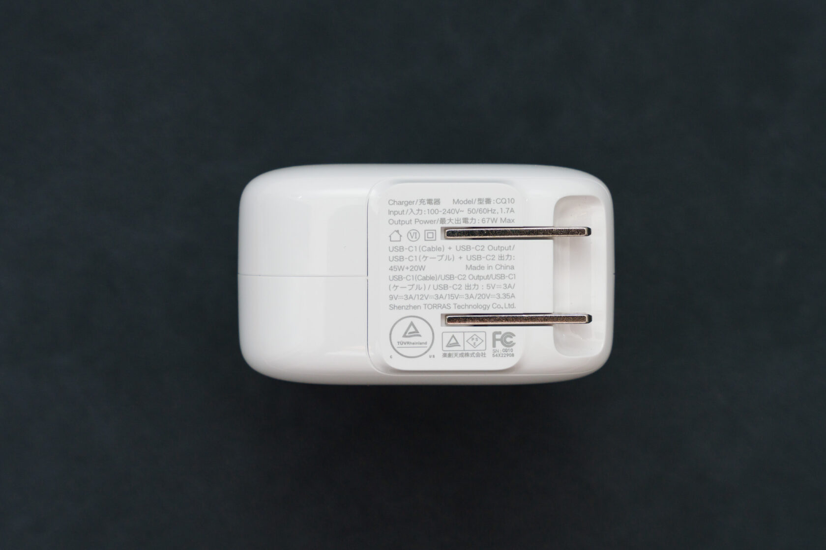 内蔵ケーブル・ポートのどちらを使った場合でも、単ポート使用時は最大67W出力というのが便利だなと感じます。意外と「2mのケーブルを繋ぎたいけど出力が足りなくなる…」なんてこと、ありますからね。