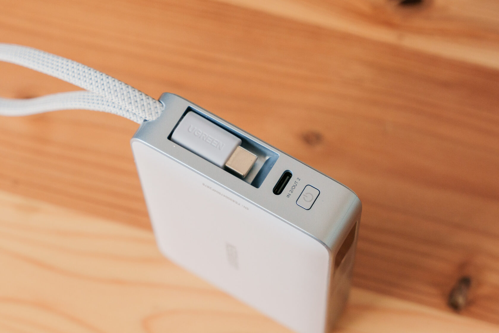 Qi2.2(25W)に対応したモバイルバッテリーではありますが、本体には出入力対応のUSB Type-Cケーブルも内蔵されていて、必要に応じて有線での充電も可能です。