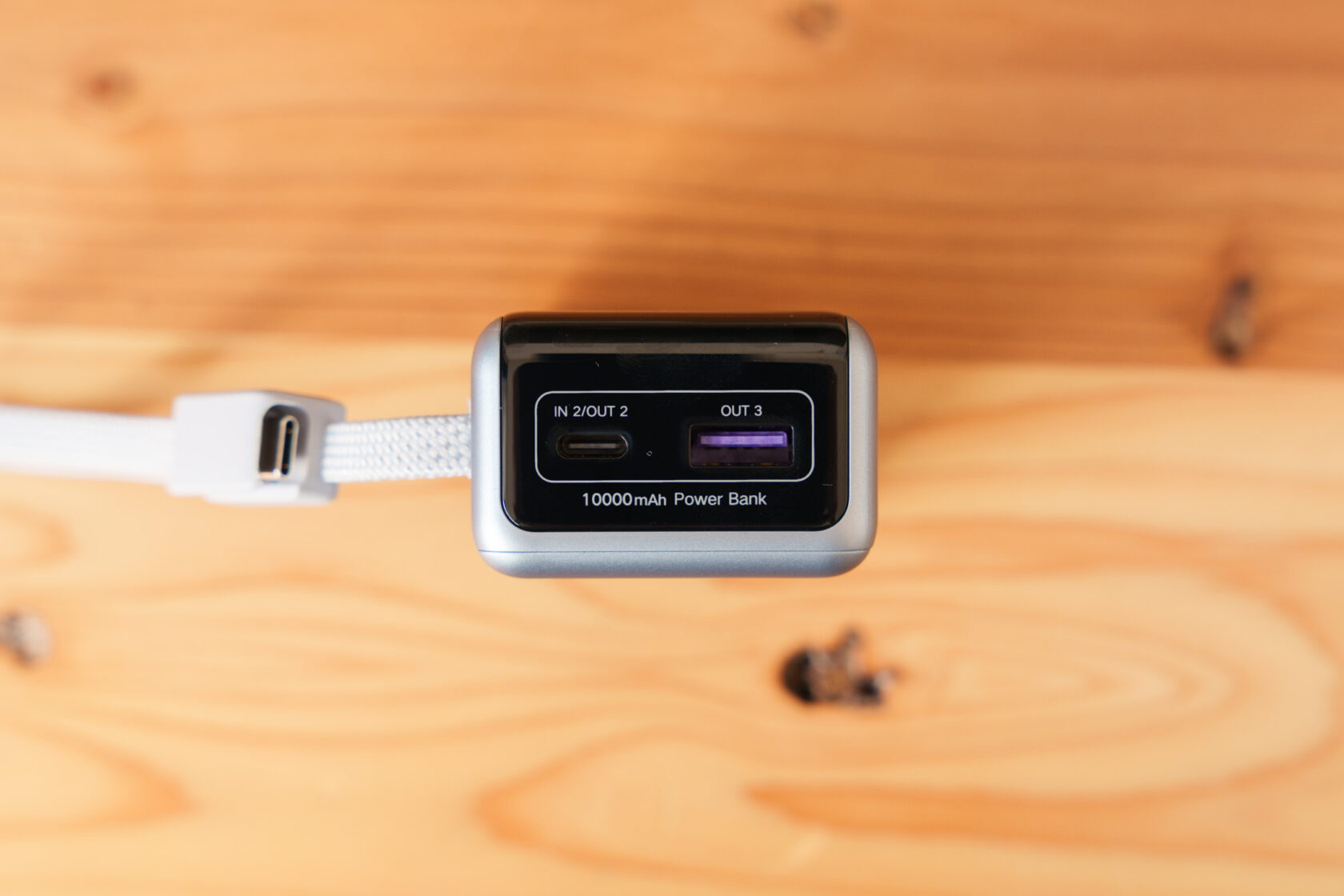 モバイルバッテリーは何十個と使ってきましたが、やっぱり10,000mAhでこのサイズが一番使いやすいです。ケーブルも邪魔にならない形で内蔵されているので、持ち歩くケーブルが1本少なくて済むのも魅力。