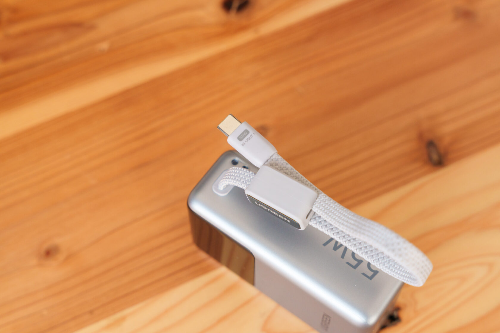 付属品は、本体のほかに携帯用ストラップとUSB Type-Cケーブル1本。ケーブル内蔵式にも関わらずケーブルが別で付属しているのは、断線や複数デバイスの同時充電を考えると嬉しいところ。