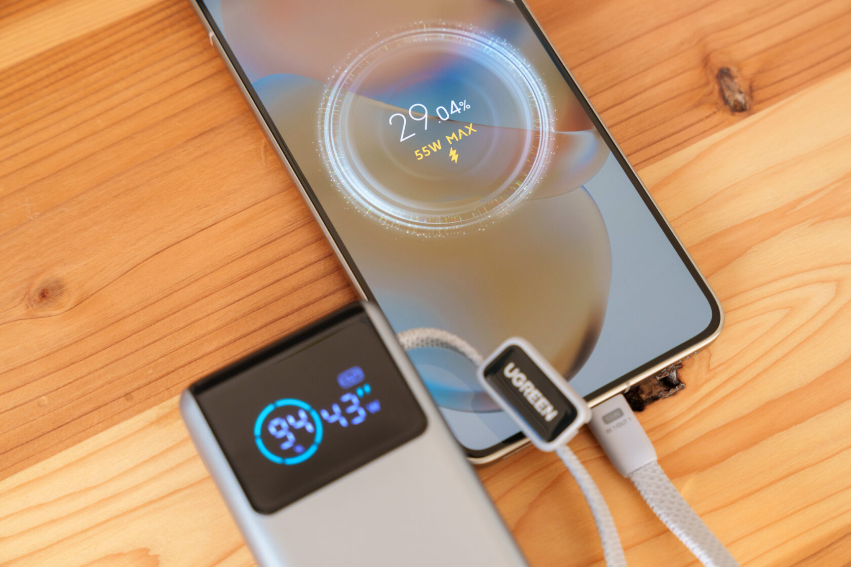 接続すると、すぐにスマホ側で「55W MAX」の表記が表示され、実測45W~50Wでの充電が始まりました。さすがに公式の120W出力と比べると充電速度は劣りますが、30分くらいで100%まで充電されるのであれば十分でしょう。